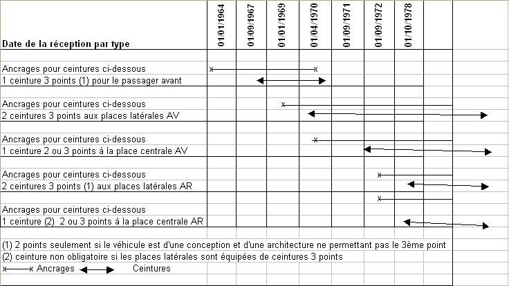 Le tableau ci-dessous indique l’obligation faite aux véhicules particuliers d’être dotés d’ancrages et de ceintures de sécurité.