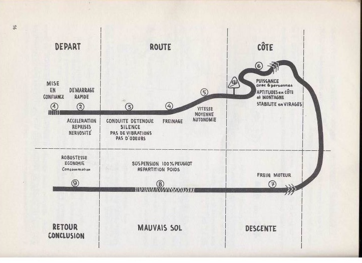 c'est issu d'une documentation réservée aux vendeurs pijot, à l'époque, qui s'appelle 'ARGUMENTATION - DEMONSTRATION", que vous pourrez retrouver dans la nouvelle mouture du dvd, et ce crobard, c'est en fait le trajet type que devait effectuer le vendeur avec le client potentiel de....la 403 diesel (j'vous l'avais dit, démarrage rapide, accélérations, silence, pas d'odeur, perfos en côtes... )