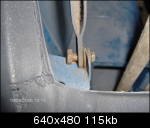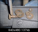 Boulon - béquille - 2 rondelles bombées (qui font ressort mais je n'ai pas le nom technique en tête) - support sur la carrosserie - rondelle plate - rondelle grower - écrou