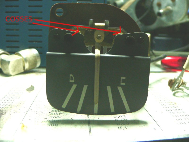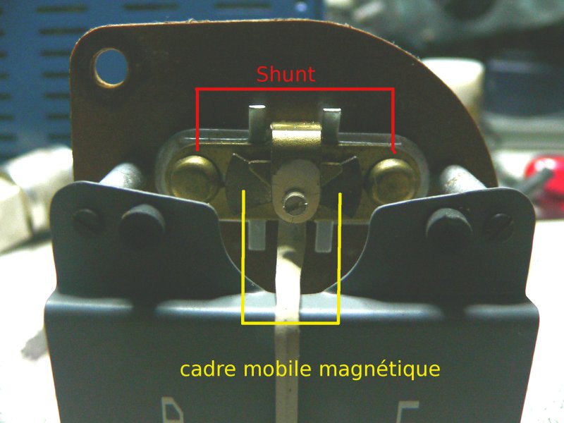 en fait, cet instrument et son aiguille ne peuvent pas passer de grosses intensités de courant, et grillerait dès l'actiion de démarrage.....pour les ampèremetres, on utilise donc ce qu'on appelle un SHUNT, sorte de ""court circuit" qui va absorber la + grande quantité de courant, et on récupère pour actionner l'aiguille juste la quantité minime nécessaire....sur cet amperemetre, le shunt genère un champ magnétique qui agit sur une lamelle...