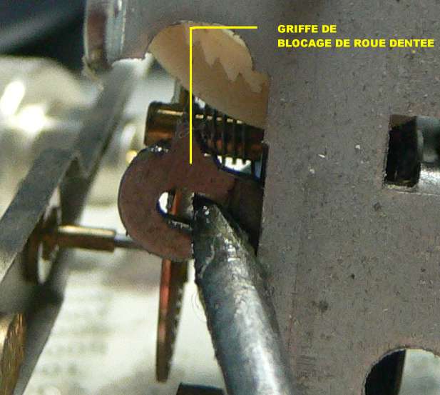 pour éviter le fonctionnement à l'envers, il y a une griffe qui vient sur la roue dentée...