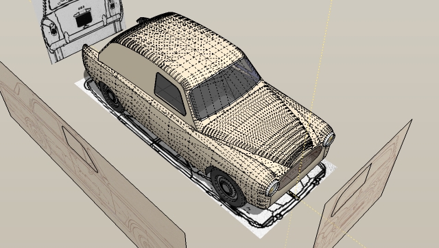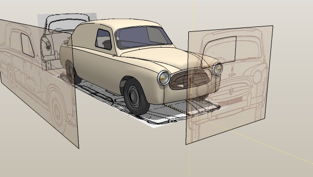 Il est pas à l'échelle, je sais pas trop pourquoi, enfin si, je crois savoir : les plans et coupes sont faux ! Comme d'hab avec les bagnoles anciennes, C'est juste des dessins ressemblant, mais en fait ce sont pas de vrais plans.