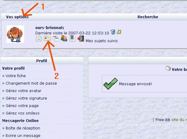 2) cliquez sur "VOS OPTIONS" de façon à faire apparaîre la ligne d'icônes, et cliquez sur l'icône "CARTE DE VISITE, à coté de l'enveloppe (enveloppe qui est l'icône des fameux MP, Messages Privés, à consulter de temps en temps )