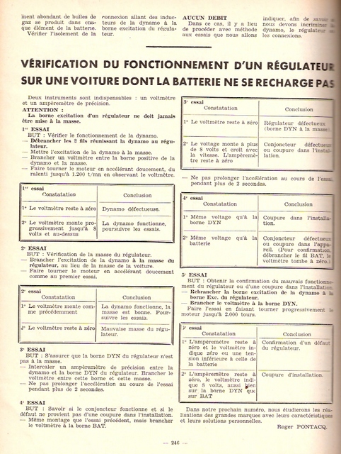 Eventuellement, si ça peut t'aider, je viens de retrouver dans ma documentation les tests pour le régulateur (cette documentation date de 1953 mais les principes de test restent valables sauf adapter les valeurs pour 12 V (6 = 12 ; 8 = 14)